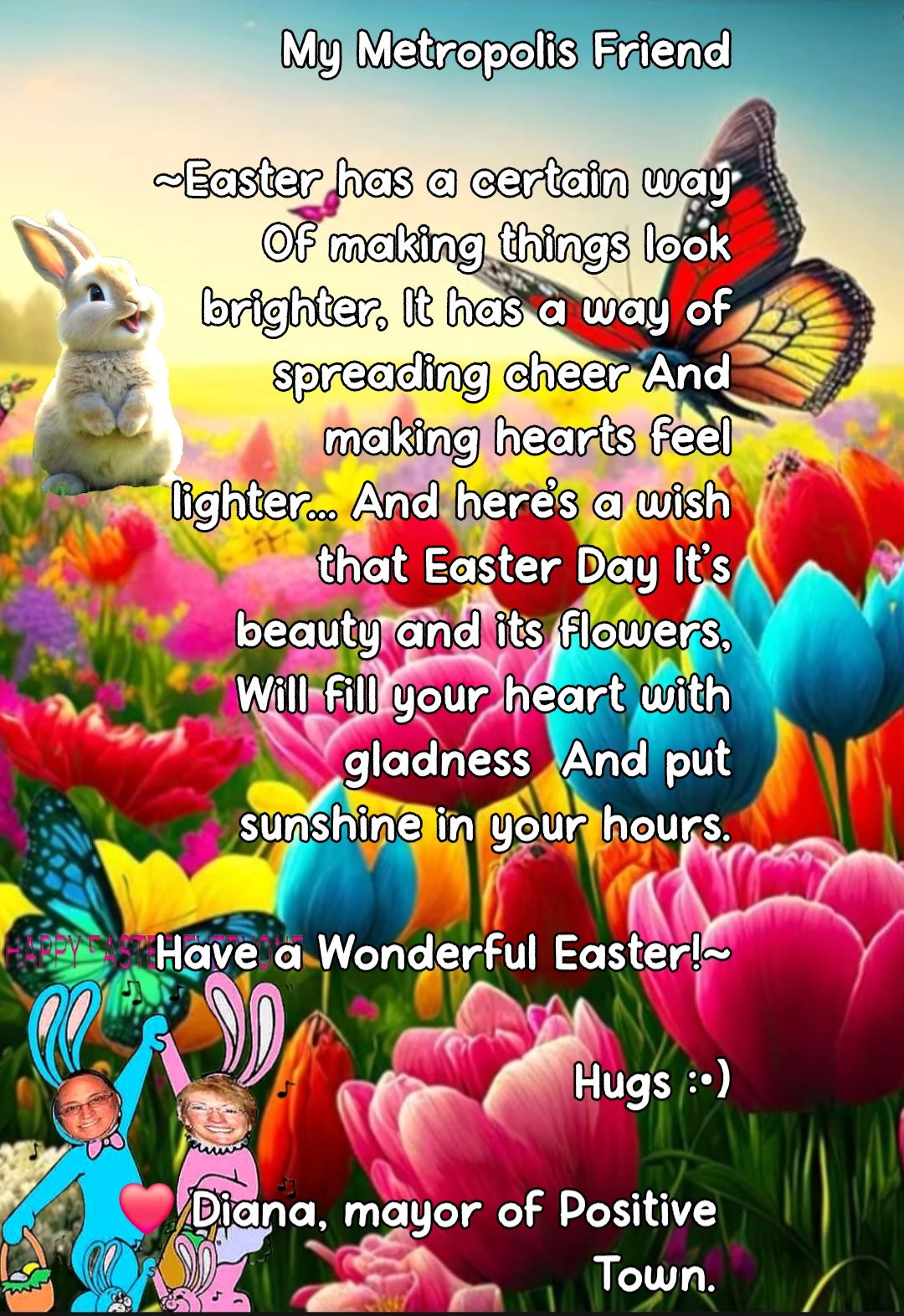 Diana Berry Pedranti, mayor ofPositive Town8 days ago~I wish that we lived in a jellybean world where every color and every flavor was appreciated and enjoyed... for then we might truly understand and celebrate the wonderful gift that is Easter. 3 Posts Available